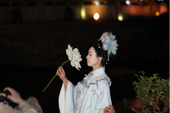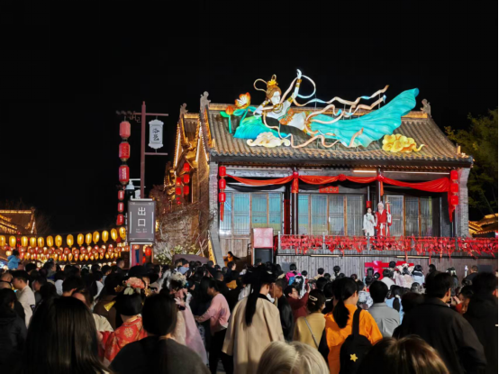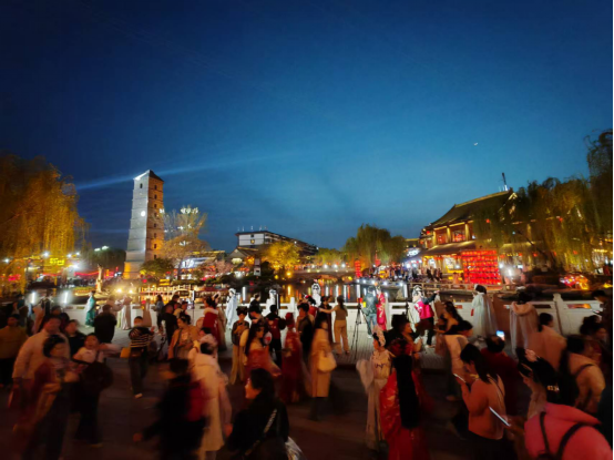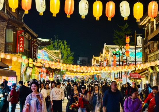 华灯初上,青砖黛瓦的中国洛阳洛邑古城在璀璨光影中游动。这座以盛唐文化为底蕴的文旅景区,形成"满城尽带绮罗裳"的独特夜景。夜幕下的古城街巷流光溢彩,珍珠妆面的游客穿着华服翩然穿行。(文图/石光明)