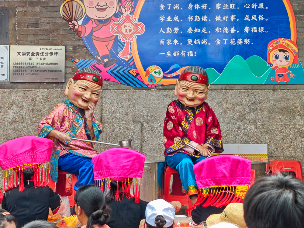 中新社报道,一大早,蒲庙镇五圣宫门前人头攒动,当地民众及游客排起长龙等待“花婆”派粥。“听说当地有‘吃了花婆粥,一生都有福’的传说,我特地从南宁市区驱车20余公里来品尝花婆粥,沾沾福气。”南宁市民陈蕾说。