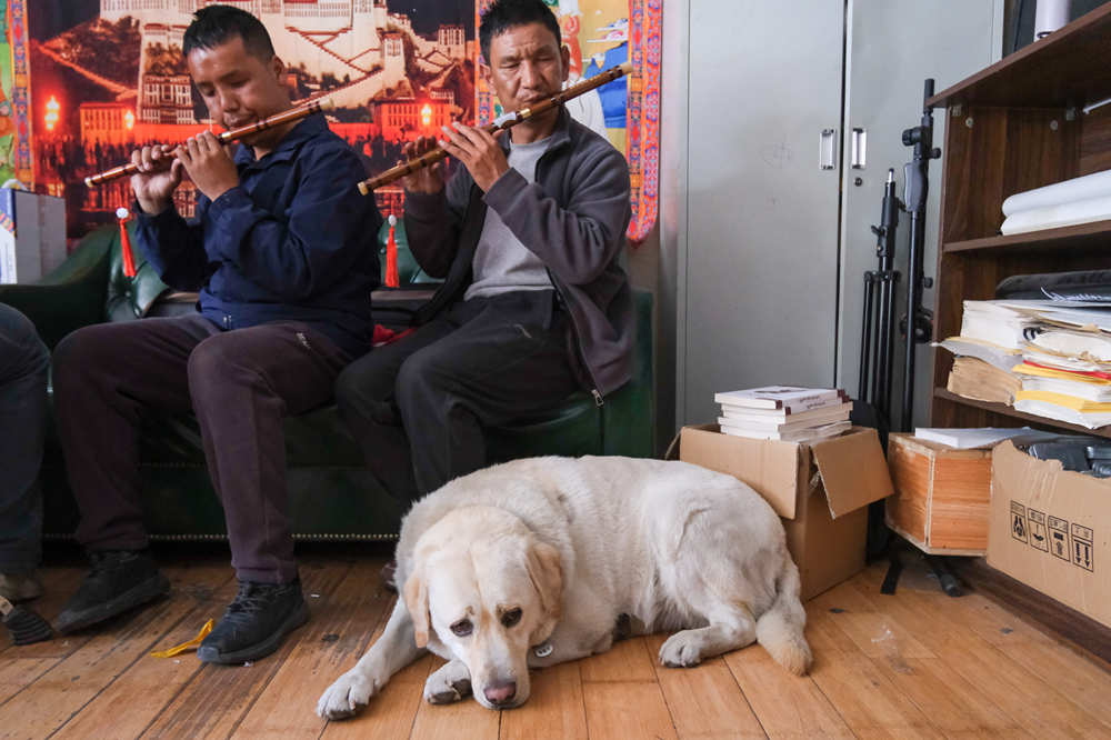 在达琼居住的藏式院落里,记者看到,他和同伴正在演练吹奏笛子,福橘则依偎在脚边,神态轻松自然,达琼偶尔抚摸,如一有呼唤,它便立即起身上前观望,看主人是否有需求。“经过近一年的相处,它现在能听懂‘过来’‘喝水’‘坐下’等几个简单的藏语指令。”