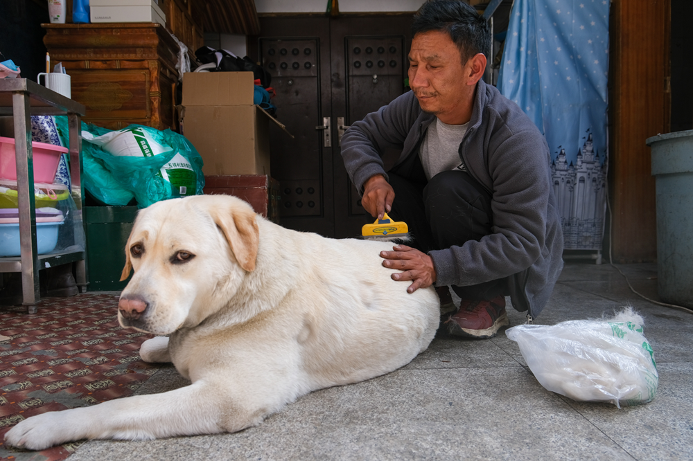 4月21日,达琼为自己心爱的导盲犬福橘梳毛。