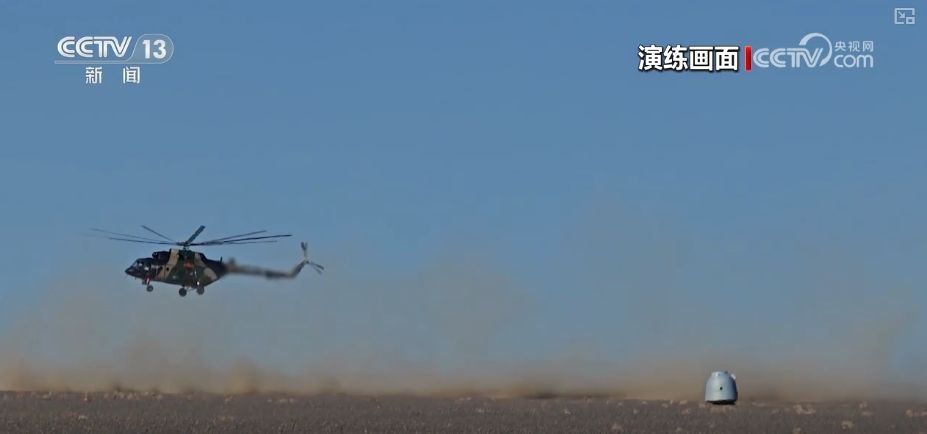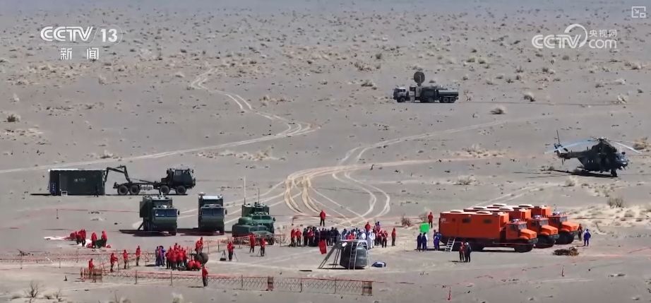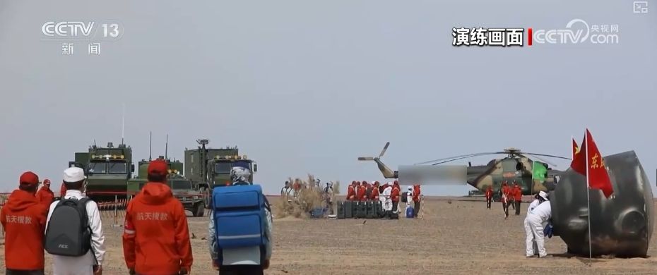 4月25日10时许,地面搜救力量指挥车、搜索车、处置车、医监医救车等近百台车辆装备,分多路向待命点集结。14时30分,在接到北京中心通报返回舱落点作标后,空中分队5架直升机精准降落在返回舱周围,按程序进行相关处置。