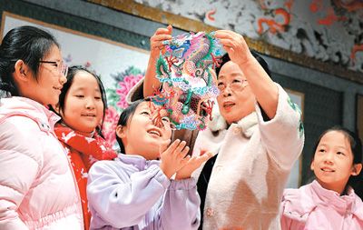 蔚县剪纸艺人周淑英在工作室给学生介绍剪纸作品。新华社记者 王晓摄