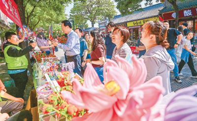 5月18日,山东省青州市古城景区举办全国助残日活动。图为游客在选购由残疾人制作的手工艺品。
