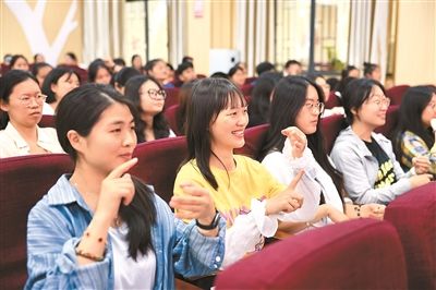 在广西壮族自治区桂林市聋哑学校举办的手语公益大课堂上,大学生志愿者学习手语。