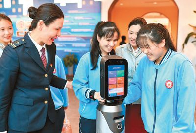在山东省胶济铁路青岛博物馆,国铁济南局青岛客运段助盲志愿者引导来自潍坊盲校的孩子与车站服务机器人互动。