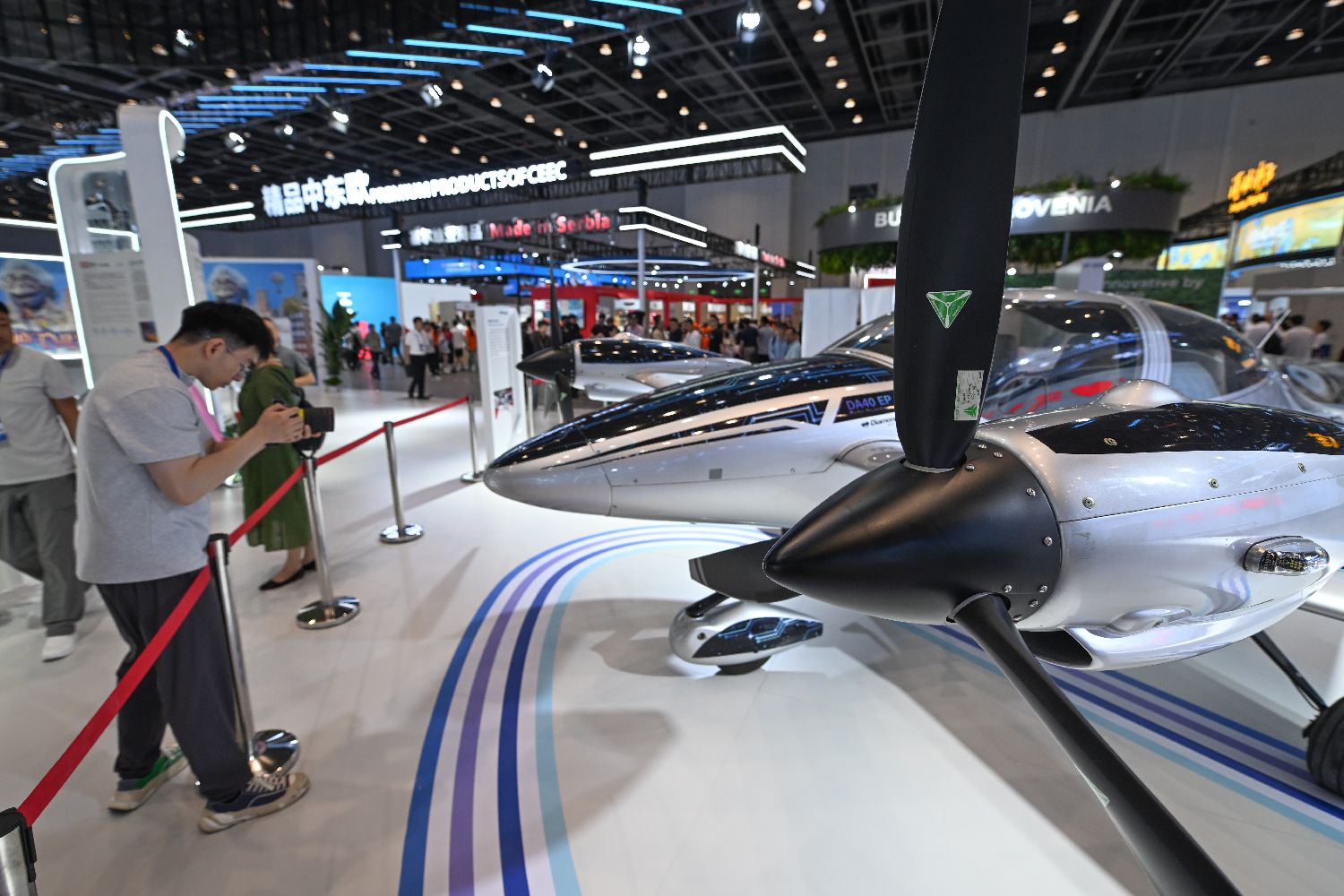 博览会设置“数智中东欧”“魅力中东欧”“精品中东欧”,以及出口消费品展区,展会总规模达8万平方米,来自14个中东欧国家的8000余种特色商品亮相。图为“数智中东欧”展区内,全球首款多发混动飞机吸引参观者。