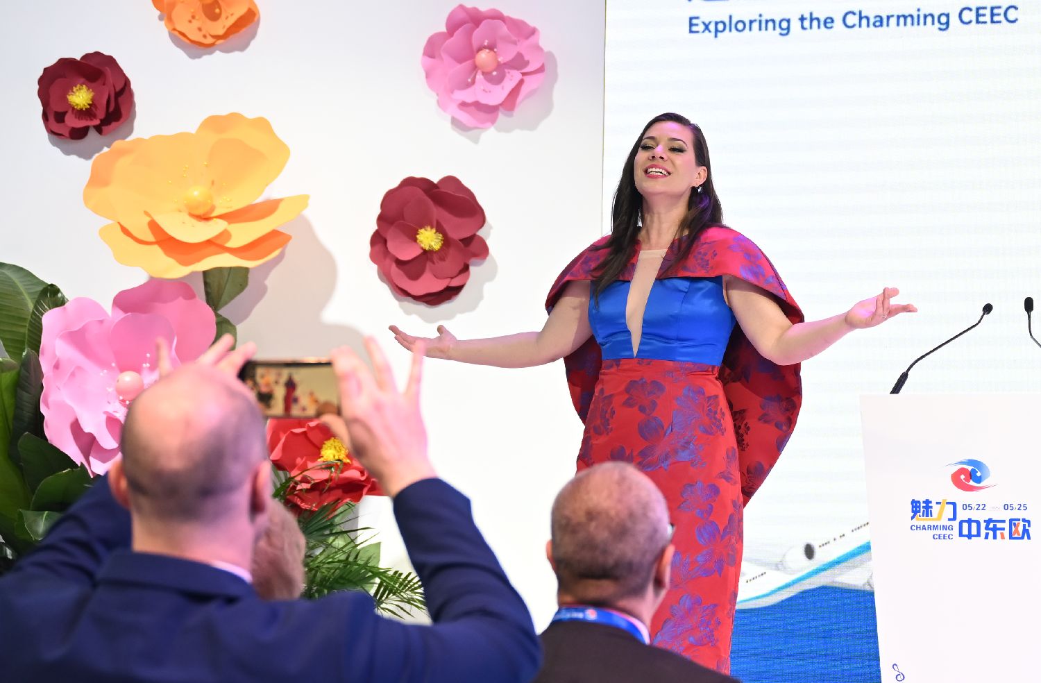 5月22日,“魅力中东欧”展区内,匈牙利籍歌唱家演唱多语种歌曲,首次设立的“魅力中东欧”展以书、艺、画、印、游等板块呈现文化交融。