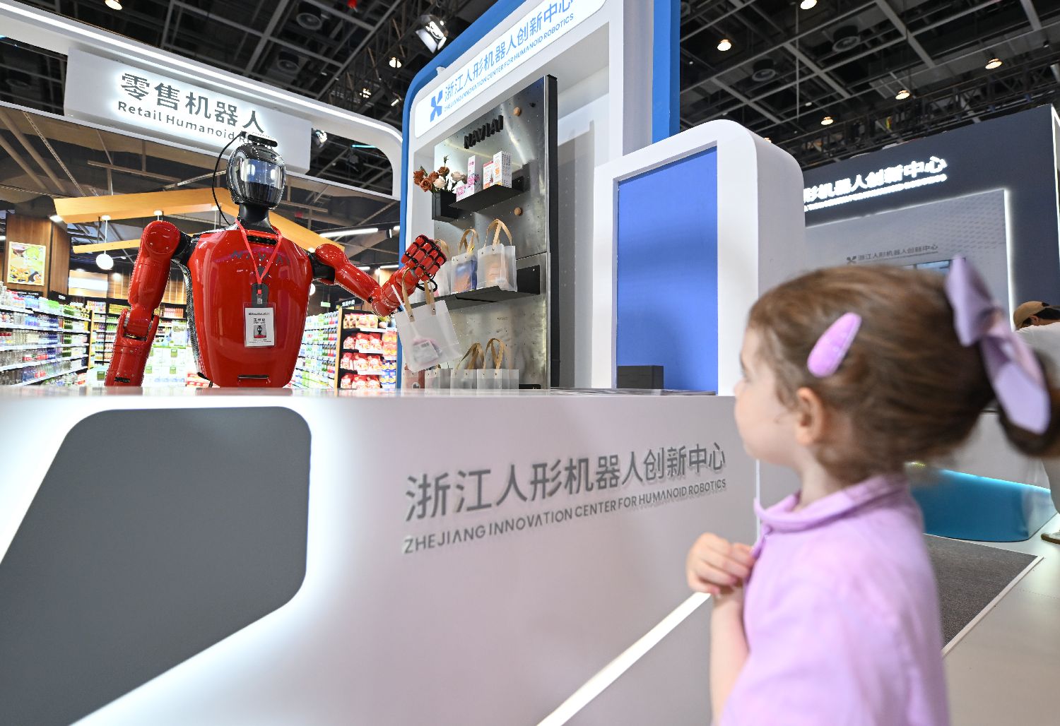 5月22日,小朋友在“数智中东欧”展区观看零售机器人操作,该展区集中呈现了来自中国、匈牙利、斯洛文尼亚等国家在人工智能、机器人技术等领域的科技成果。