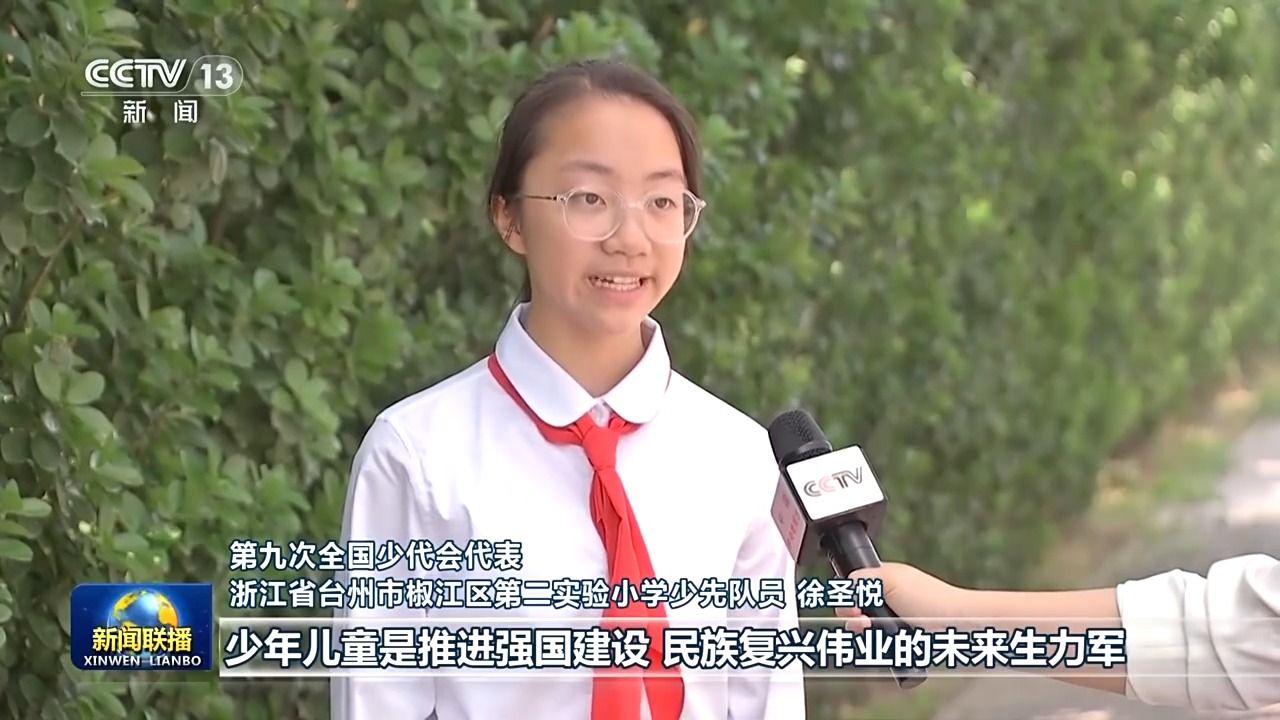 第九次全国少代会代表浙江省台州市椒江区第二实验小学少先队员徐圣悦:习爷爷在贺信中说,少年儿童是推进强国建设、民族复兴伟业的未来生力军。这是对我们少年儿童的殷切期望。我来自浙江台州,大陈岛垦荒时期爷爷奶奶们艰苦奋斗、无私奉献的故事伴随我长大。我们要以垦荒队员们为榜样,好好学习,砥砺品格,健康成长,长大后报效祖国和人民。