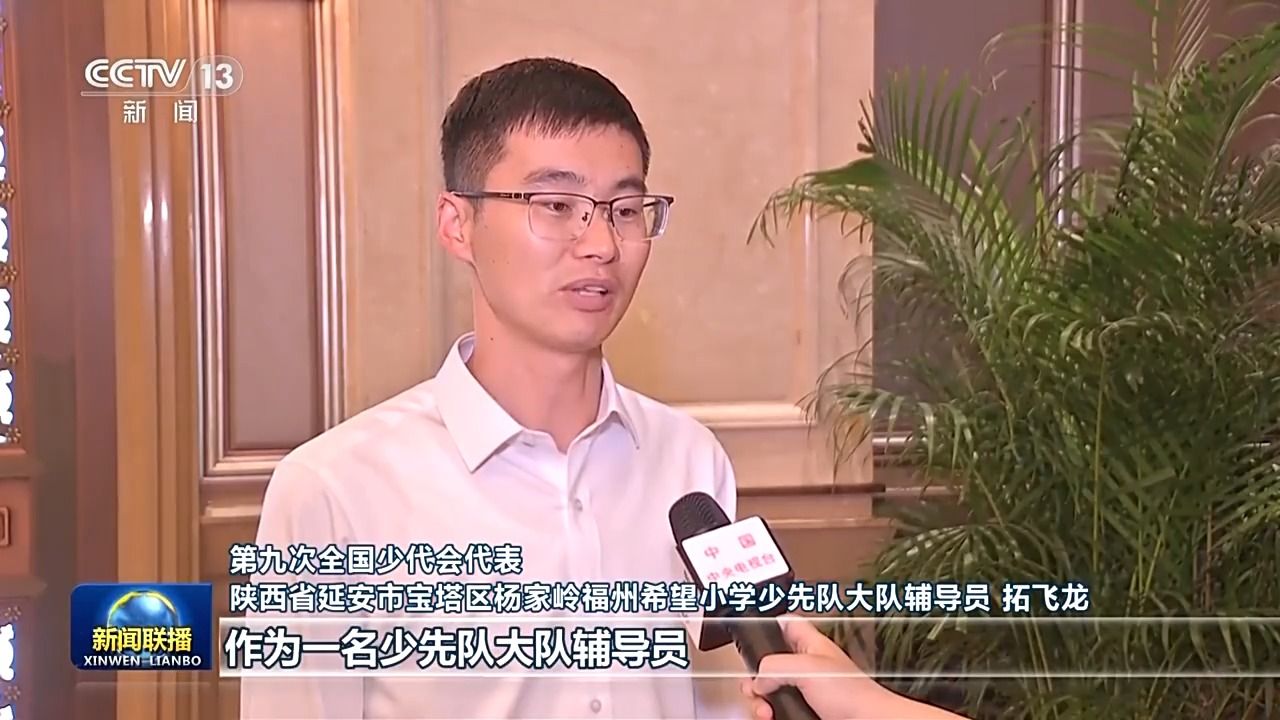 第九次全国少代会代表陕西省延安市宝塔区杨家岭福州希望小学少先队大队辅导员拓飞龙:我怀着无比激动的心情聆听了习近平总书记的贺信,作为一名少先队大队辅导员,我深感责任重大、使命光荣。在新征程上我将围绕“新时代好少年”的标准,教育引领少年儿童立志向、修品行、练本领,为少年儿童健康成长、全面发展贡献力量。