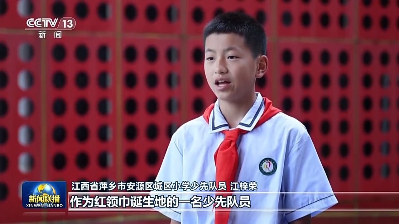 江西省萍乡市安源区城区小学少先队员江梓荣:作为红领巾诞生地的一名少先队员,我将牢记习爷爷的嘱托,继承光荣传统,传承红色基因,做红色文化的讲述者,让红领巾的故事感染更多人;做红色文化的践行者,树立远大理想,勤奋学习知识,努力成长为爱党爱国、勤奋好学、全面发展的新时代好少年。