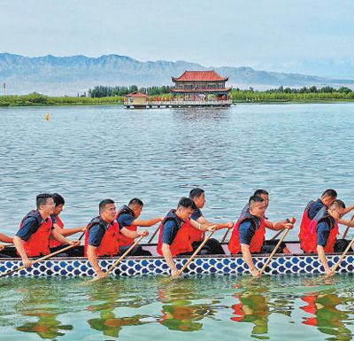 龙舟队在甘肃高台大湖湾水域竞渡。