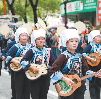 贵州惠水巡游踩街上演布依八音弹唱。惠水县融媒体中心供图