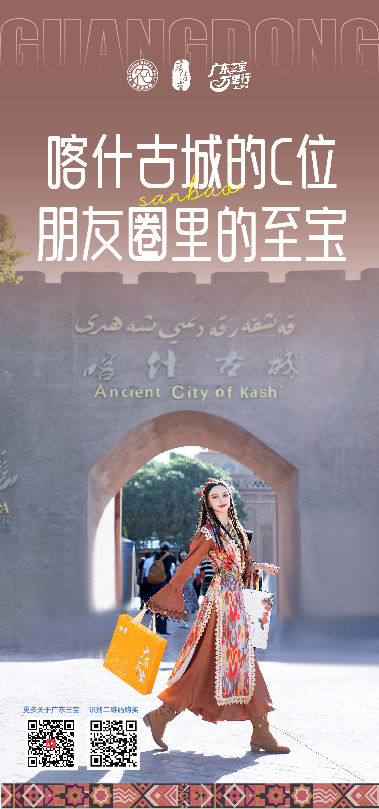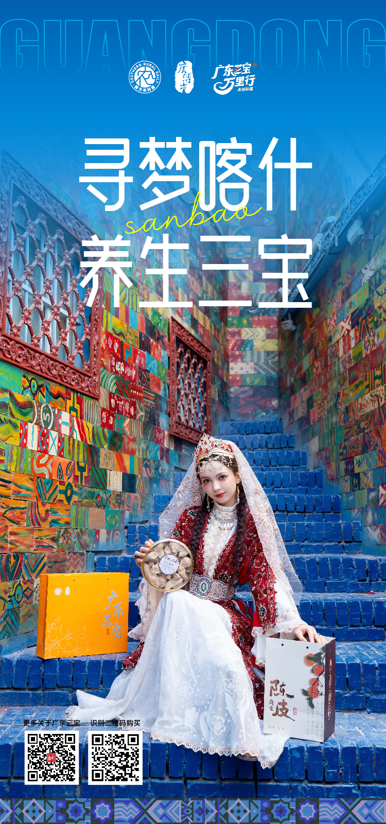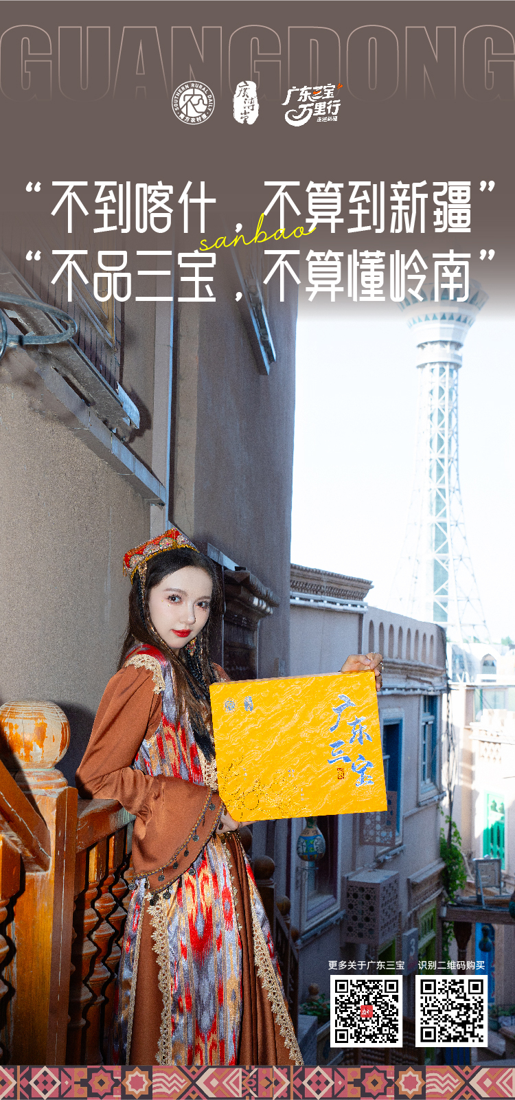 广东三宝,是南方农村报打造的“广东人自己的手信”,由新会陈皮、化橘红、春砂仁组合而成,是岭南地区久负盛名的中药材和食材。“亚克西!”在喀什首日亮相,广东三宝当即吸引游客群众观看和品尝,好评不断,更有“古丽”倾情“打call”。