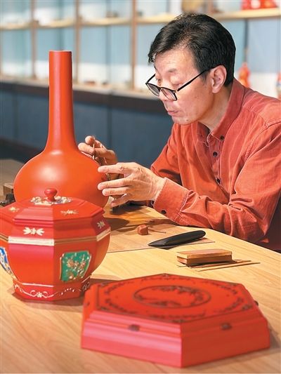 黄才良在工作室中制作泥金彩漆器物。