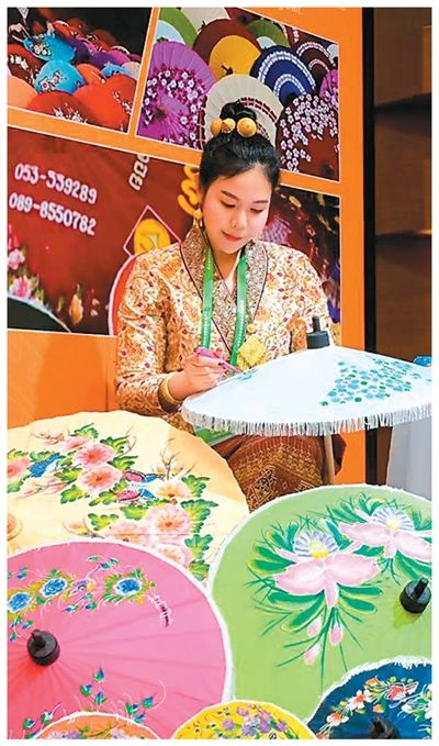 泰国手艺人在清迈展区创作博桑伞绘画。