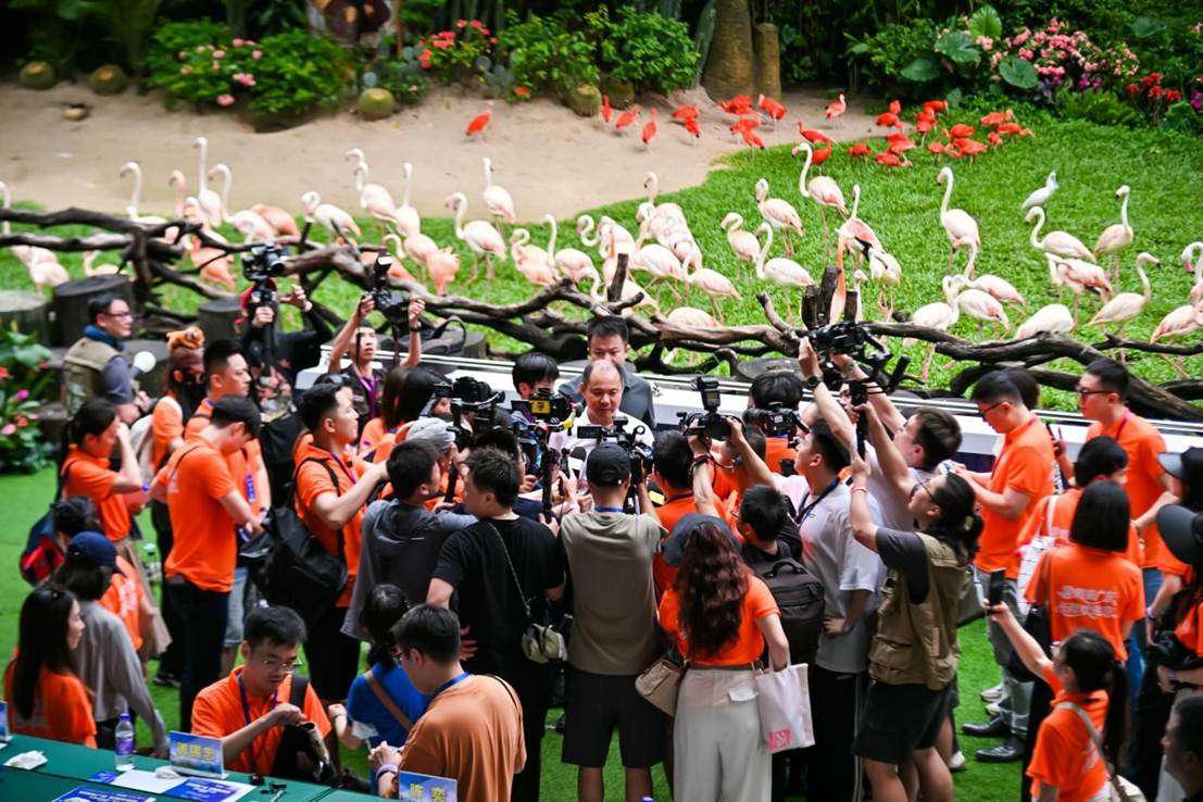 活动现场,火烈鸟身披粉红羽衣,脖颈轻弯,优雅踱步;双角犀鸟白羽翻飞,在空中盘旋......这奇妙一幕让现场瞬间沸腾,“哈哈哈哈太会营业了!”惊呼声化作阵阵笑声,混着快门声,成了最生动的欢迎曲。