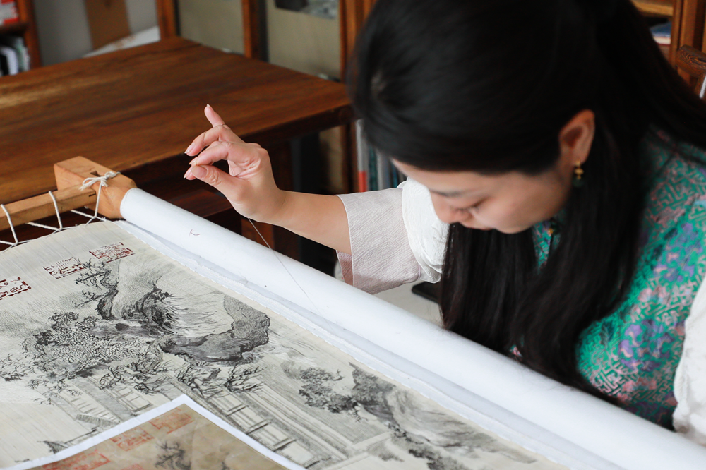 经过潜心研究,张小红探索出既能保留夏布自然肌理美感,又能适用于艺术刺绣的面料处理方法。但即便如此,也需要绣艺师们不断积累经验去掌握好丝线的粗细以及下针的力道,做到因材施艺、因物施针。