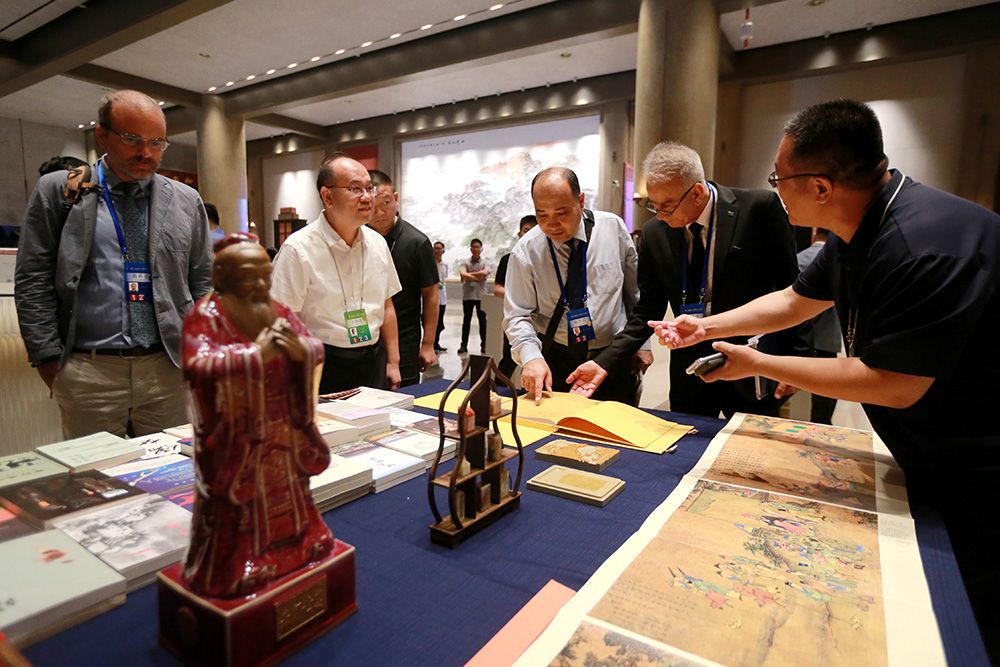 7月9日,第十一届尼山世界文明论坛在山东曲阜启幕。图为中外嘉宾阅览儒家典籍、赏鉴文创产品。(图片来源:中新社)