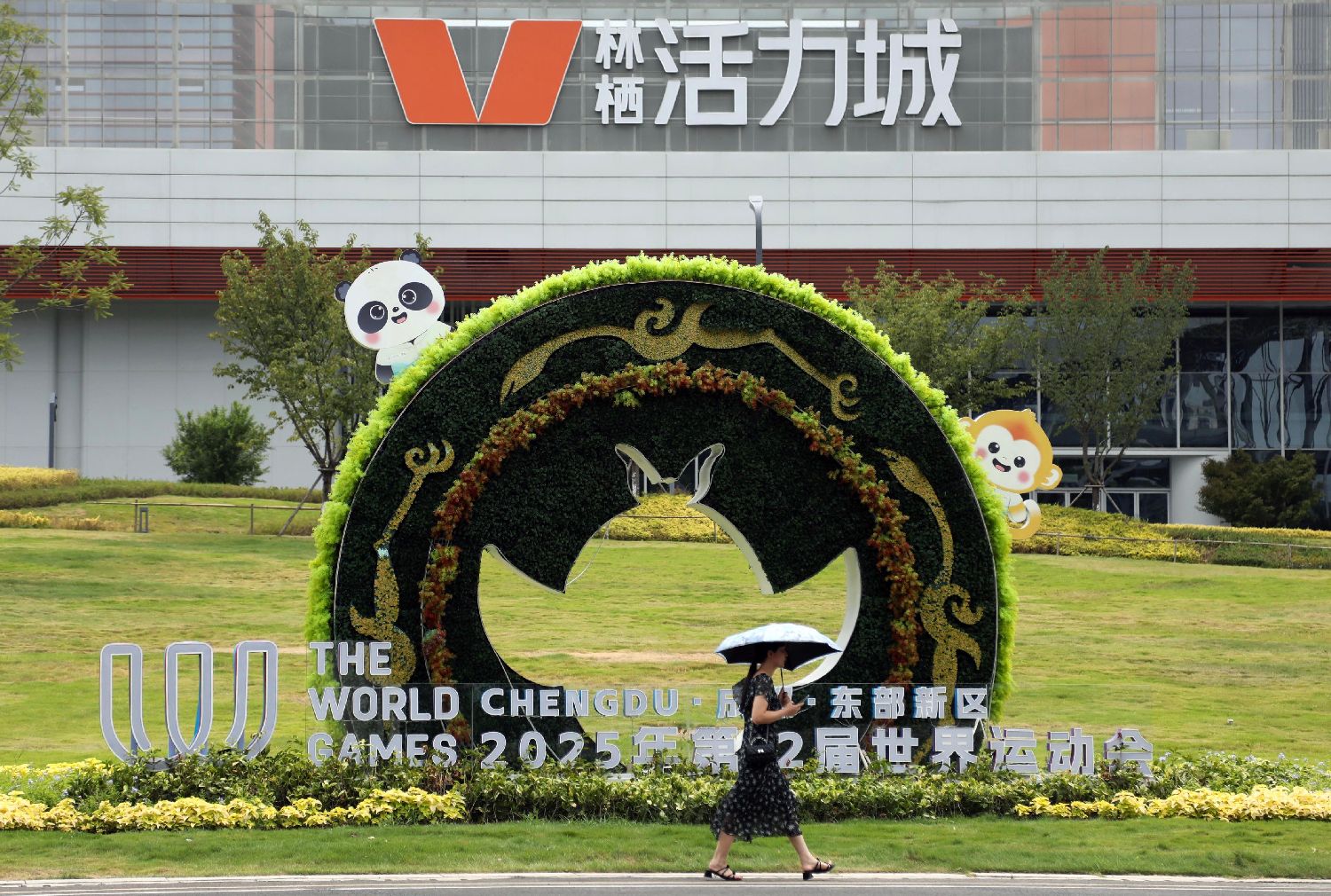 8月4日,位于四川成都西部金融创新中心的成都世运会主媒体中心正式开放。据介绍,主媒体中心是赛事期间注册媒体的“大本营”,为主转播机构、持权转播商及注册媒体提供赛事报道所需的办公、语言、交通、餐饮、技术、商业配套等设施与服务。图为行人从主媒体中心外一花环景观前走过。(图片来源:中新社)