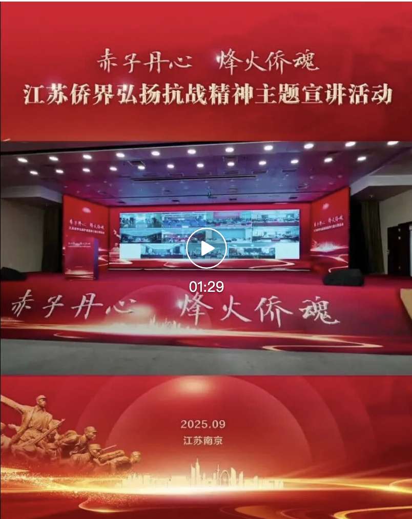 9月4日,由江苏省侨联、江苏省侨办联合主办的“赤子丹心•烽火侨魂”江苏侨界弘扬抗战精神主题宣讲活动在南京举办。省委常委、省委统战部部长胡广杰出席活动并致辞,省委统战部、省外办、省侨办、省侨联、新华日报社、南京市委统战部、南京市侨联、中山陵园管理局等相关部门负责同志,以及陈纳德将军外孙女嘉兰惠等抗战老兵后人、海外侨领和归侨侨眷代表约200人现场出席。省侨联主席、党组书记刘标主持。活动还在宁外12个设区市侨联设置了分会场,并向全球直播,在线播放量近百万。