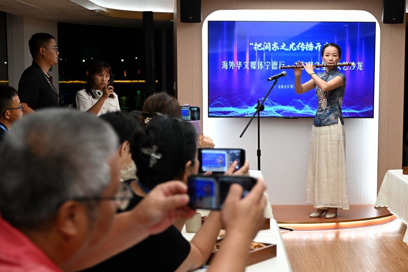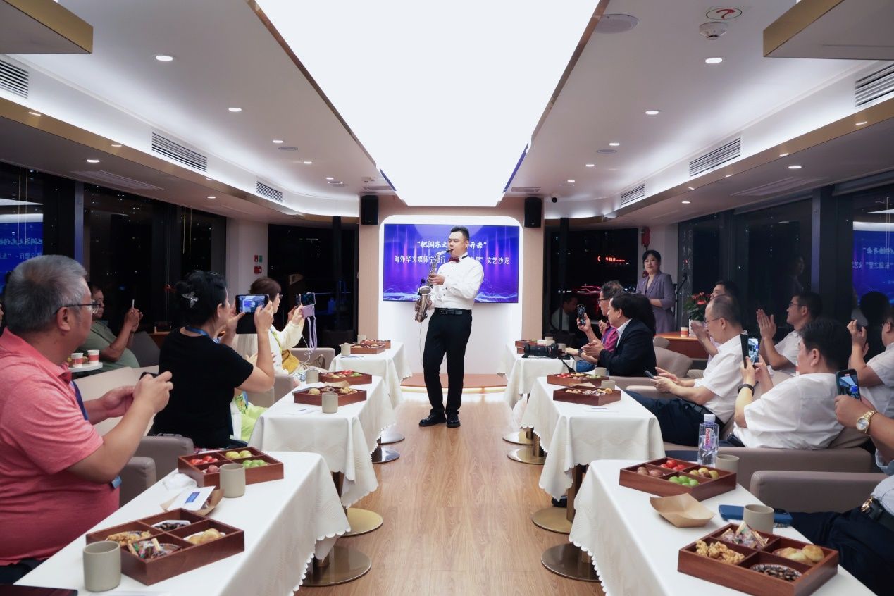 “东湖之星”文艺沙龙现场,海外华文媒体代表体验“零碳文旅”、共赏文艺沙龙。图为萨克斯独奏。(图片来源:吕若萱 摄)
