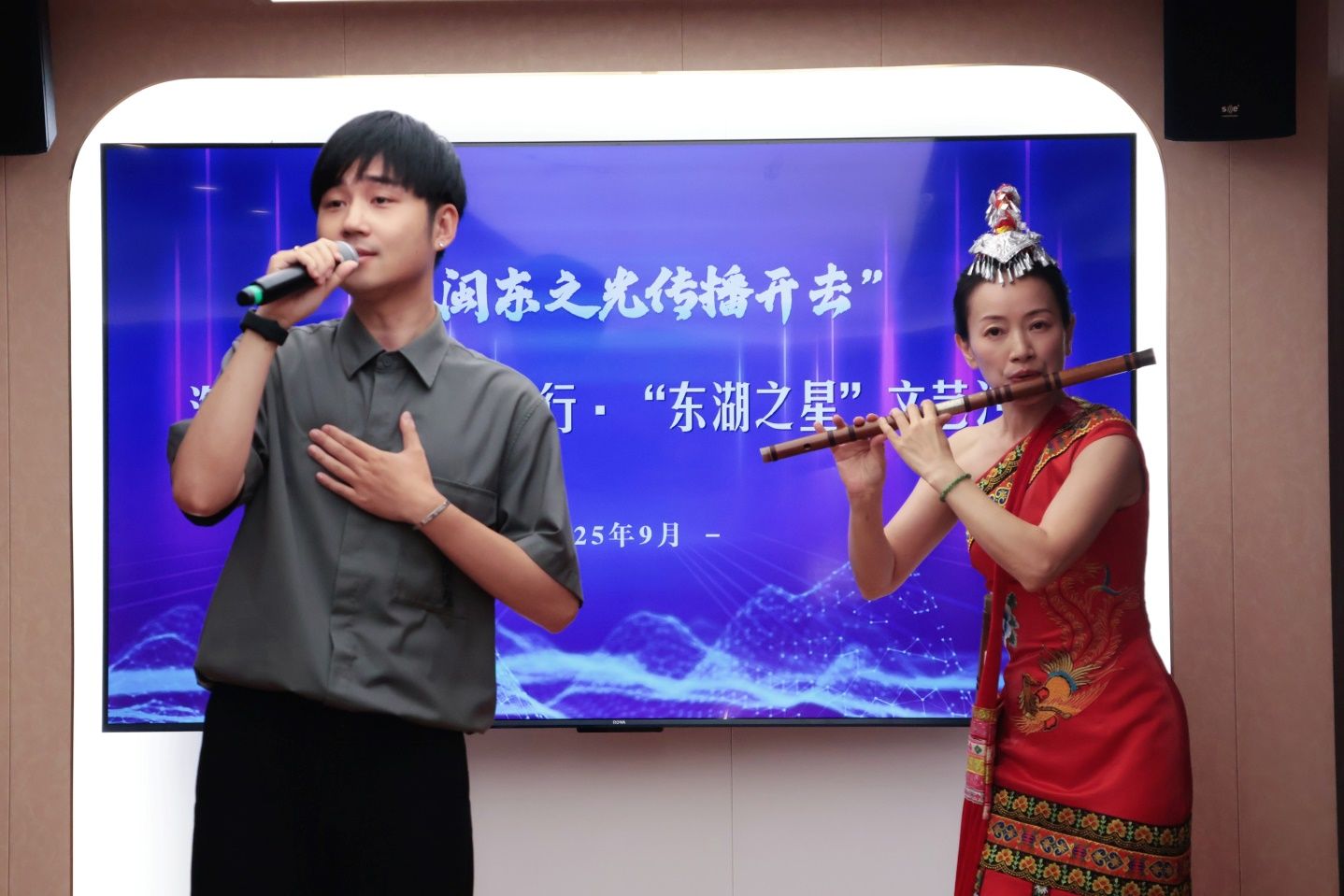 茶艺表演《天山茶韵》、女声独唱《望月》、笛子独奏《半山听雨》、朗诵《我有幸生活在这里》、口琴五重奏《诗人与农夫》、萨克斯独奏《大地的港口》《走过咖啡屋》、男声独唱《故乡的海》、男声独唱与笛子《再唱山哈传家宝》……行驶于湖面的“东湖之星”电动船舶内,内容丰富、形式多样的文艺节目接续上演。