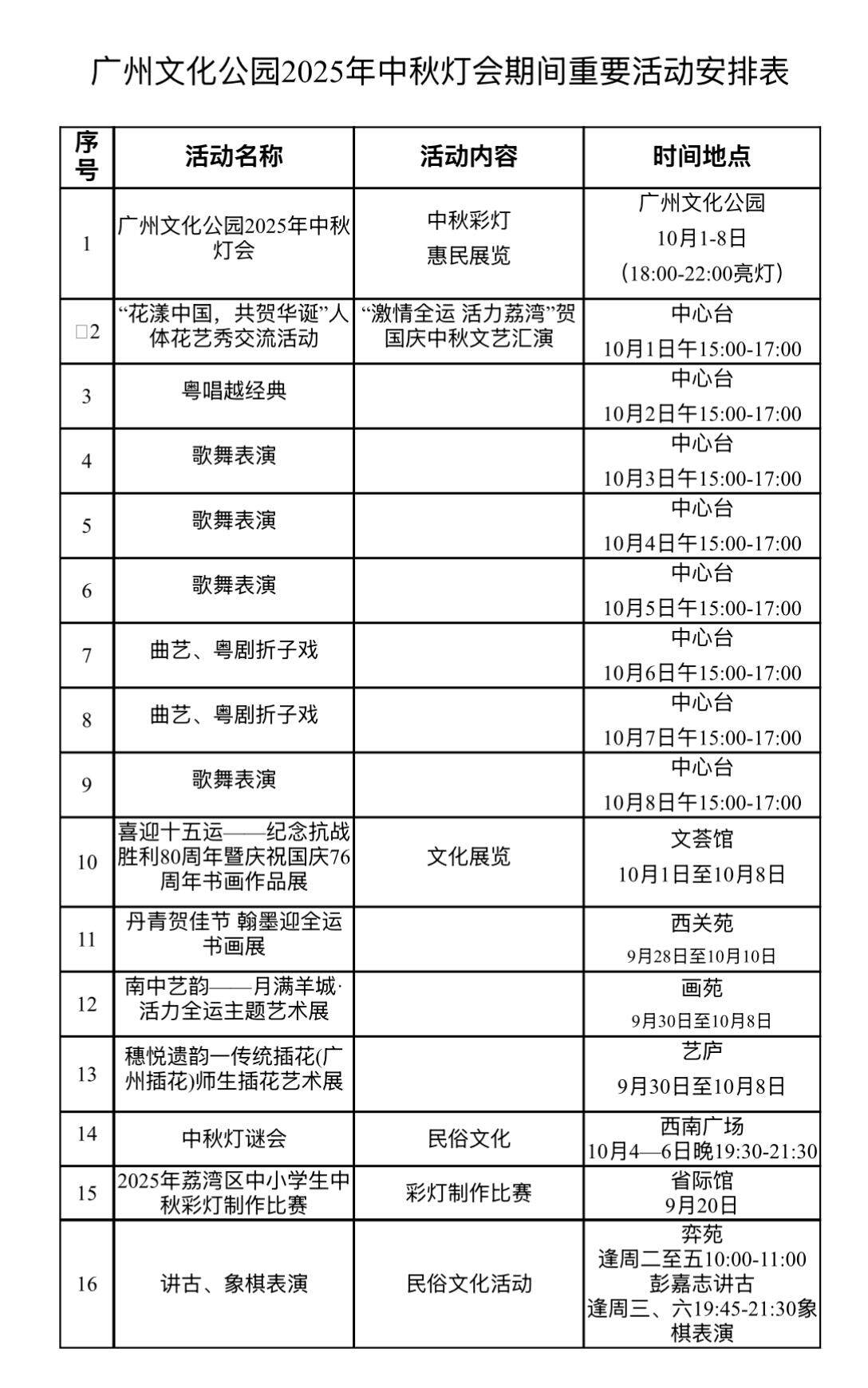10月4日至6日19:30-21:30,市民游客可以到西南广场,体验到文化公园历史悠久的“中秋灯谜会”。讲古活动逢周二到周五上午,在羊城讲古坛开讲,中秋期间照常举行。