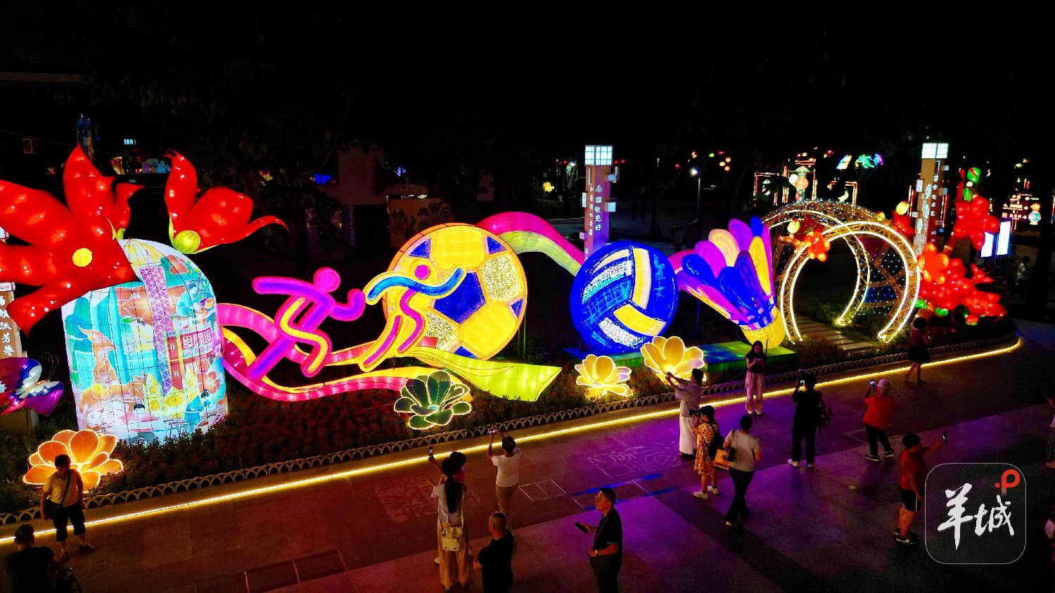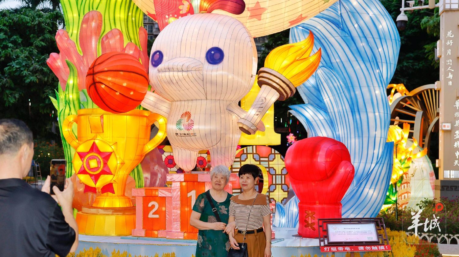 本届中秋灯会紧扣“喜迎十五运”主题,以《乘风破浪海天阔》为核心灯组,也是正门门楼造型,十五运会吉祥物彩灯“喜洋洋”“乐融融”与多项动态运动项目巧妙融合,这也是广州首个以彩灯形式呈现的全运会吉祥物。该彩灯通过扎作工艺与现代灯光技术,呈现运动节奏与光影律动的视觉盛宴。
