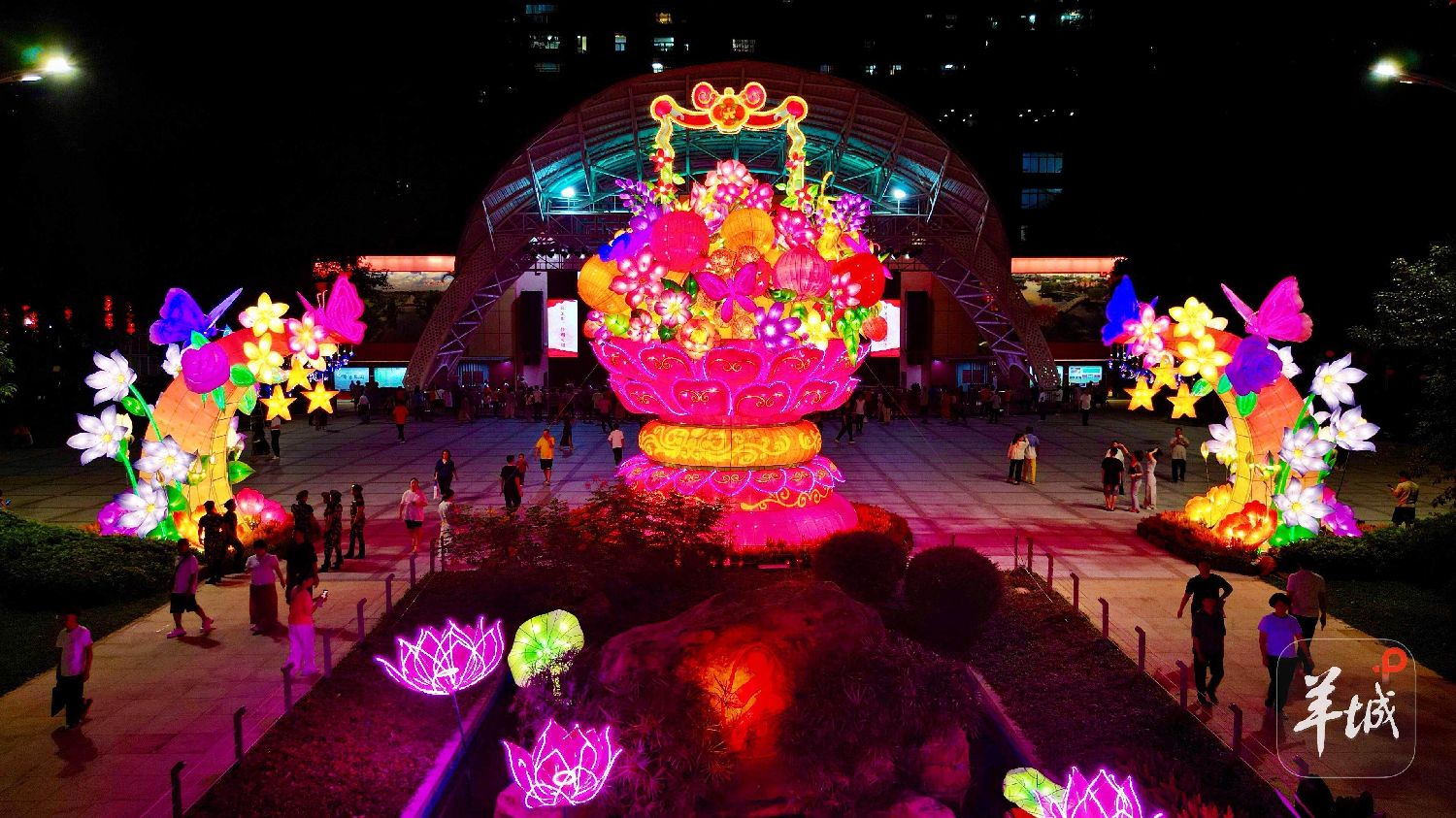 公园中心广场上,有一个古典大花篮造型,灯组以鲜花和岭南佳果为创作主体