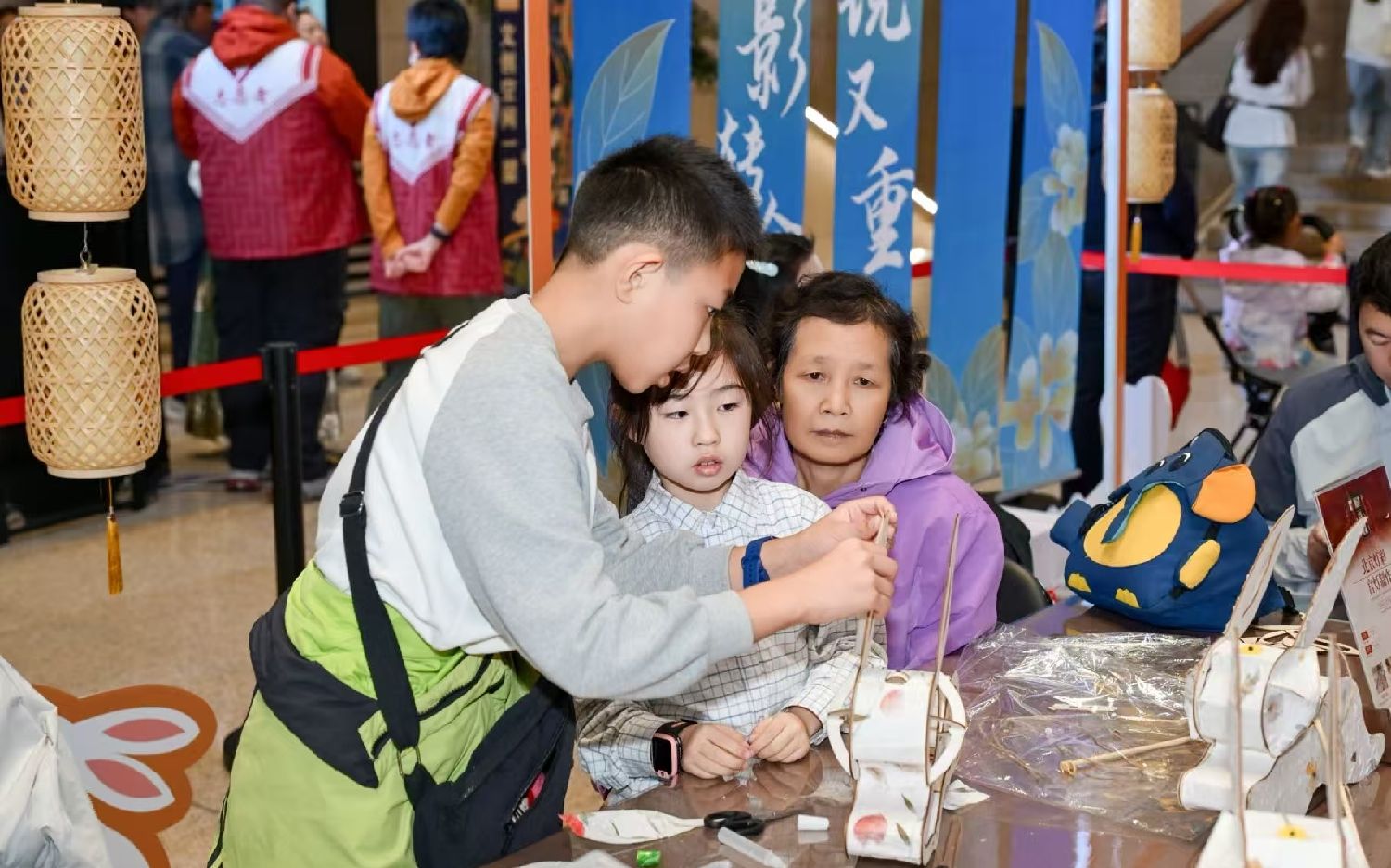 中新社报道,大厅舞台上,表演者指尖轻提细线,木偶灵动演绎出嫦娥在月宫俯瞰人间美景的片段,细腻的动作、鲜活的神态,让木偶仿佛拥有生命。大厅另一边的非遗手工艺体验区有北京宫灯、盘扣制作、传统制香等,吸引不少人参与。