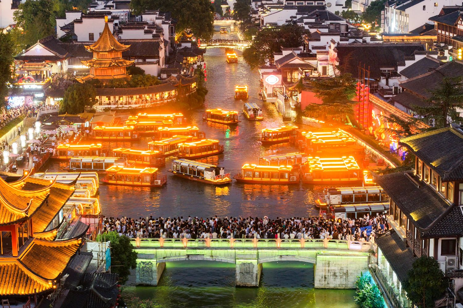 10月5日,江苏南京,游客们在城南夫子庙景区游览。(无人机照片)(图片来源:中新社)