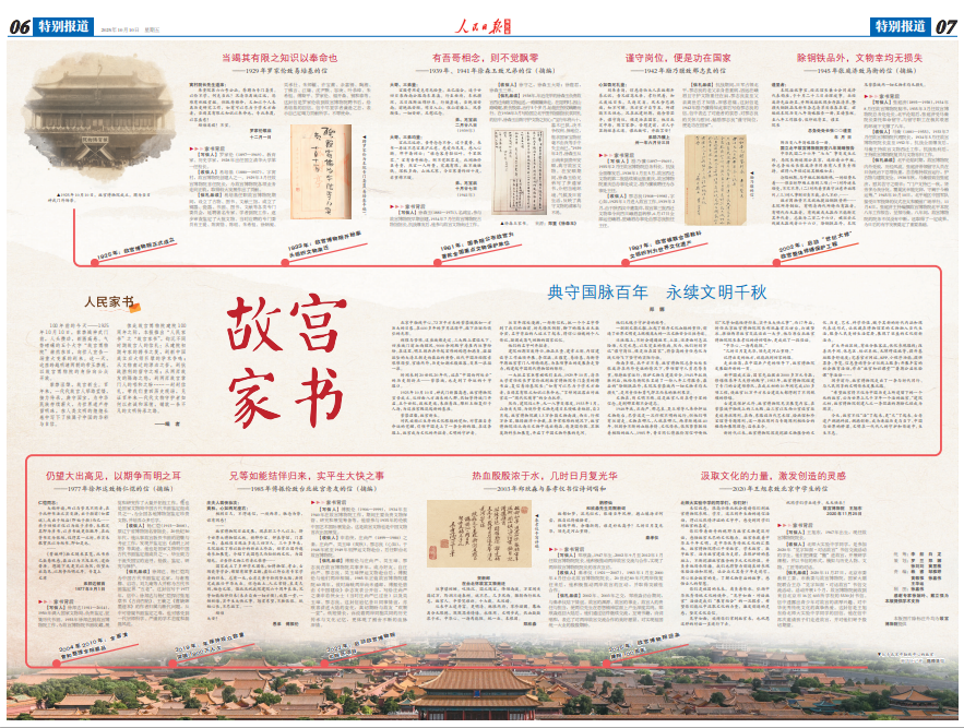 值此故宫博物院建院100周年之际,本报推出“人民家书”之“故宫家书”,钩沉不同时期故宫人的信札:从建院初期专家的聘书之复,到新中国成立后大师巨擘的学术争鸣;从文物南迁的漂泊之苦,到抗战胜利的留守之艰;从两岸故友的隔海之愁,到两岸故宫掌门人的唱和之盼⋯⋯一封封信札,带我们重回历史现场,见证百年来一代代文物守护者如何以赤诚和深情,铺就一条不凡的文明传承之路。