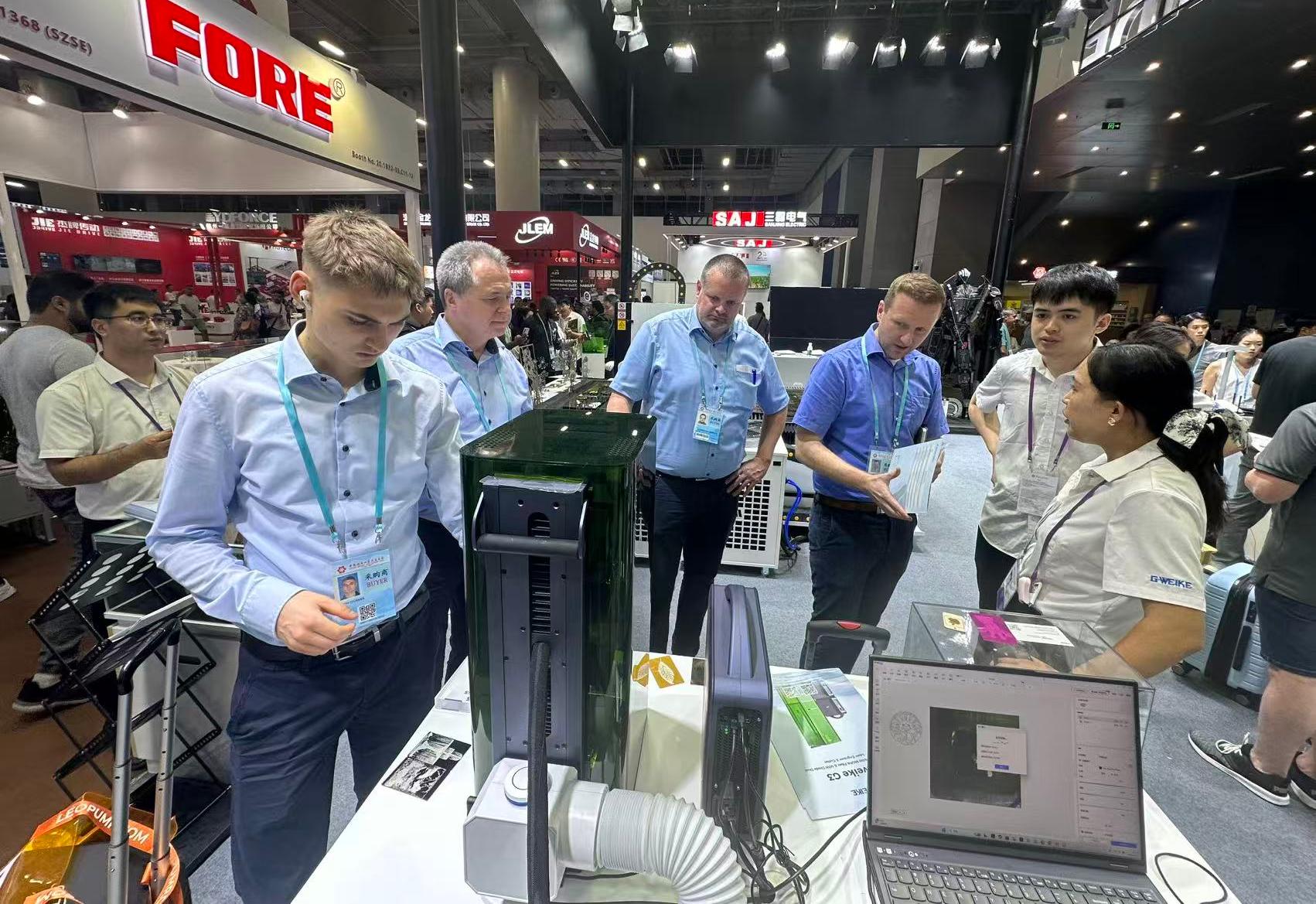 10月16日,第138届广交会继续在广州举行。图为境外采购商正在了解中国企业展出的激光打标机。(图片来源:中新社)