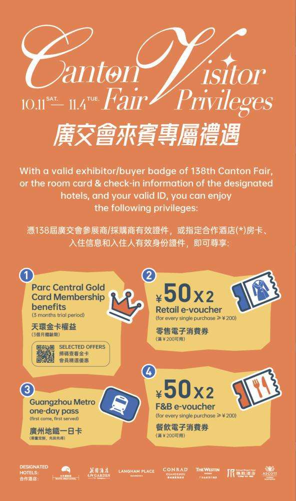 位于天河路的天環Parc Central近期升级了广交会专属礼遇。即日起至11月4日,凭广交会有效证件可至商场B2层礼宾处领取价值超2000元的礼包,含广州地铁一日票、餐饮消费券等实用权益。