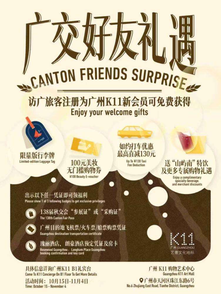 同时,广州K11购物艺术中心为广交会来宾准备了“广交好友礼遇”。10月15日至11月4日期间,新注册会员可领取限量行李牌、打车优惠券及特饮兑换券,让风尘仆仆的客商们先卸下行程疲惫。