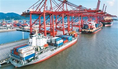 在宁波舟山港金塘港区大浦口集装箱码头,船舶进行集装箱装卸作业。邹训永摄(新华社发)