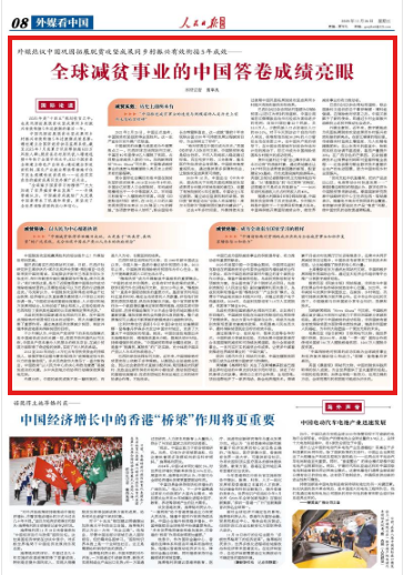 英国《晨星报》网站刊文称,中国的脱贫实践所取得的惊人成就,为全世界提供了至关重要的经验。中国的经验表明,如果全球能一致努力,运用正确的方法,全球范围内的贫困是可能成为历史的。(本报记者 贾平凡)