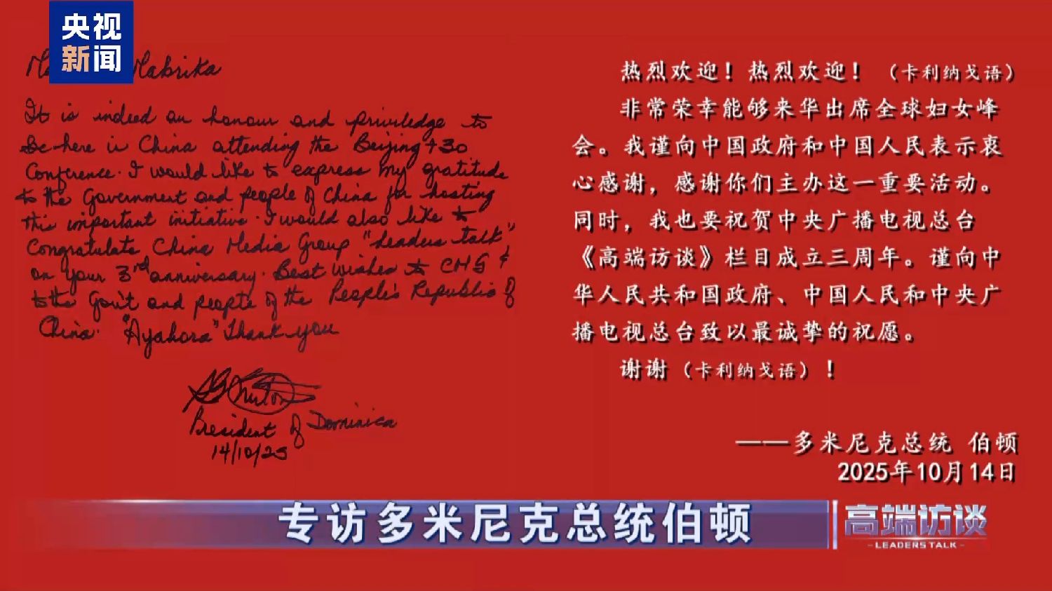 多米尼克总统伯顿在接受总台专访后题词: