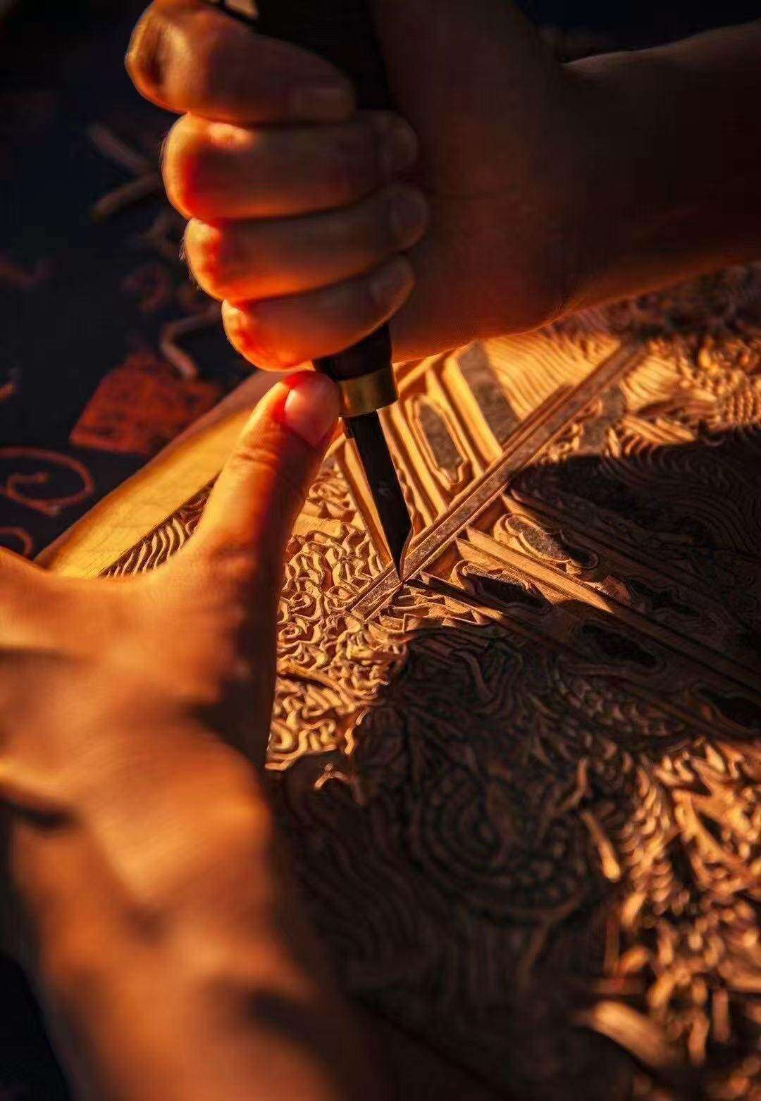 刘钟萍师从国家级代表性传承人冯炳棠。“纸会告诉你、木版会告诉你、刻刀会告诉你”,师傅的教诲被她刻进日常。从选木、刻版到套印、描金,二十余道工序,她日复一日打磨,指尖的厚茧见证了与古老手艺的对话。