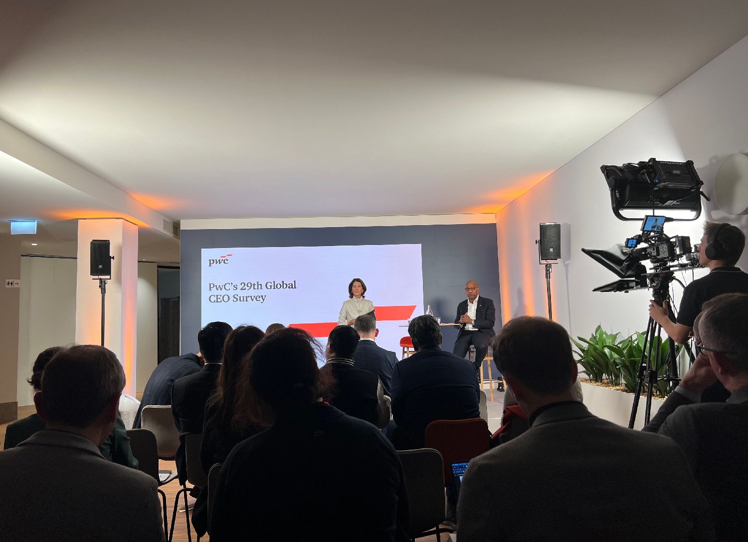 当地时间1月19日晚,会计师事务所普华永道在瑞士达沃斯发布《第29期全球CEO调查报告》。图为发布会现场。(图片来源:中新社)