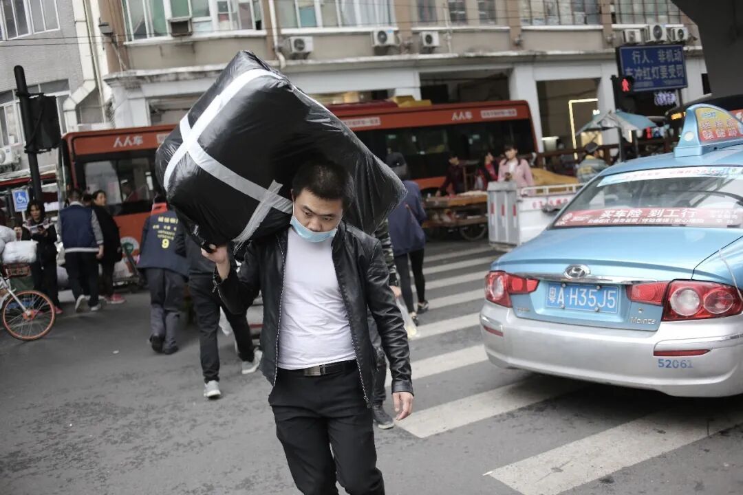 ▲广州十三行服装批发街,进货商大包小包进出批发点图/视觉中国
