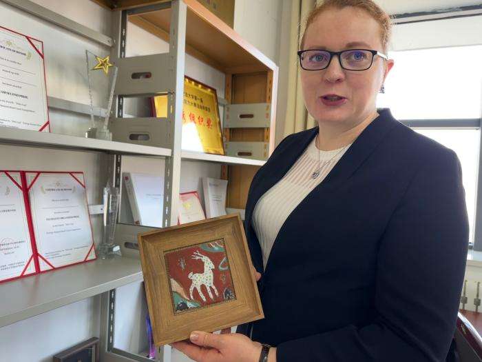 图为奥莉娅·普隆金娜展示她绘画的九色鹿作品。(图片来源:中新社)