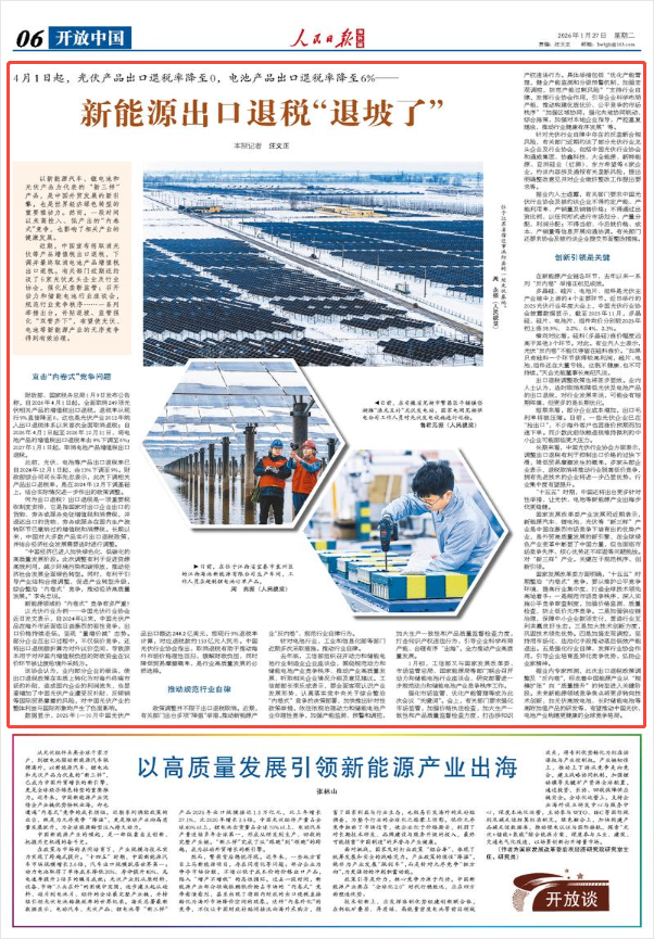 据业内专家预测,此次出口退税政策调整及“反内卷”,标志着中国能源产业从“规模扩张”向“质量提升”的转型进入关键阶段。未来新能源领域竞争焦点将更多转向技术创新,如光伏高效电池、长时储能电池等高附加值产品的研发等,有望推动中国光伏、电池产业构建更健康的全球竞争格局。(本报记者 汪文正)