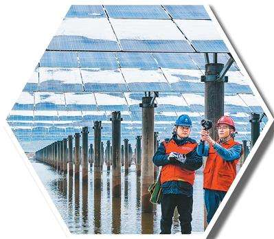日前,在安徽省芜湖市繁昌区平铺镇岱湖滩“渔光互补”光伏发电站,国家电网芜湖供电公司工作人员对光伏发电设施进行巡检。鲁君元摄(人民视觉)