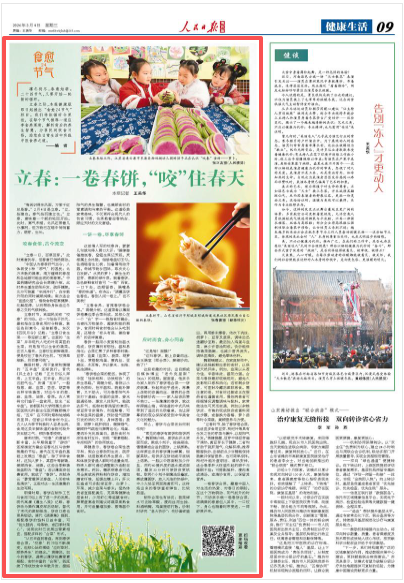 “从五辛盘到春盘,再到春饼卷合菜,‘咬春’的习俗不断演变,但核心始终围绕‘应时取材、顺势养生’的理念。”蒋健说,如今的春饼,通常以薄饼包裹荤素搭配、食材丰富的“合菜”,既延续了传统饮食中辛散升发、提振阳气的养生智慧,也兼顾食材的荤素调和与寒热平衡。这道经典家常美味,不仅更符合现代人的饮食习惯,也承载着迎春纳吉、顺应天时的文化意涵。