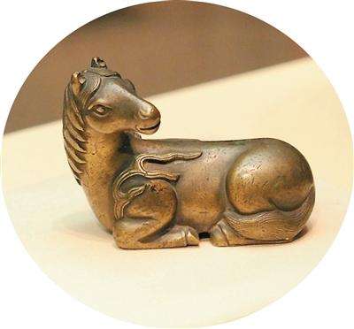 来自秦始皇帝陵博物院的鞍马俑是此次展览中“最古老的马”。它出土于陕西西安秦兵马俑二号坑,是骑兵俑的坐骑。它四蹄直立,劲健有力,两耳如削竹,耳前有鬃花,尾巴扎成长辫。马背上有鞍鞯,鞍鞯周围缀有缨络和短带,鞍钉、肚带、参扣等皆清晰可见。
