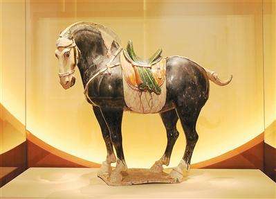 唐三彩黑釉陶马是展览中的“明星文物”,为国内仅有的两件唐代黑釉陶马之一。这件马俑除面、鬃、尾、蹄涂白釉外,全身披黑釉,有“四蹄踏雪”之美感,其造型雄健,釉色调匀,姿态自然,是唐三彩马中不可多得的精品。中国国家博物馆策展人许文珺介绍,唐马雕塑一改秦汉时期平稳古拙的风格,多展现出高昂彪悍的姿态,反映了唐代的审美风尚。唐墓中出土的各种三彩马,都有头小、臀圆、体态匀称、膘肥体壮的特点,是当时西域马体型的写照。