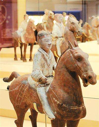 展厅中央,数十件西汉彩绘陶兵马俑整齐列阵,气势威武。它们出土于陕西咸阳杨家湾汉墓,距汉高祖刘邦的长陵约4公里。墓中出土的兵马俑分大小两种,大骑马俑的马有黑、红、紫三色,马身彩绘马鞯和辔头等,骑士身着红、白、绿、紫等服饰,有的披黑色铠甲;小骑马俑体格更轻巧。马姿态生动,或静立,或昂头嘶鸣。骑士一手呈持兵器状,一手作勒缰状。许文珺说,汉兵马俑军阵中出现大量骑马俑,反映西汉初年骑兵已具有一定规模。
