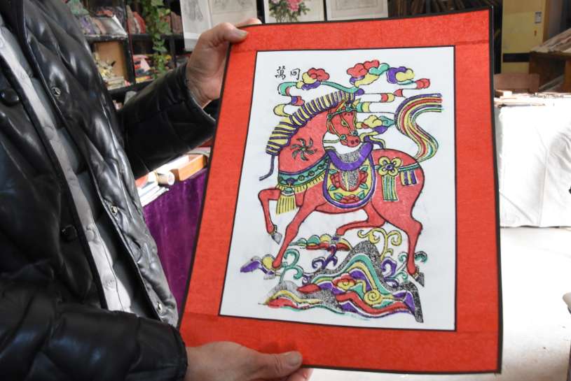 2月5日,河南开封朱仙镇木版年画手工艺人展示“马踏祥云”作品。(图片来源:王宇摄)